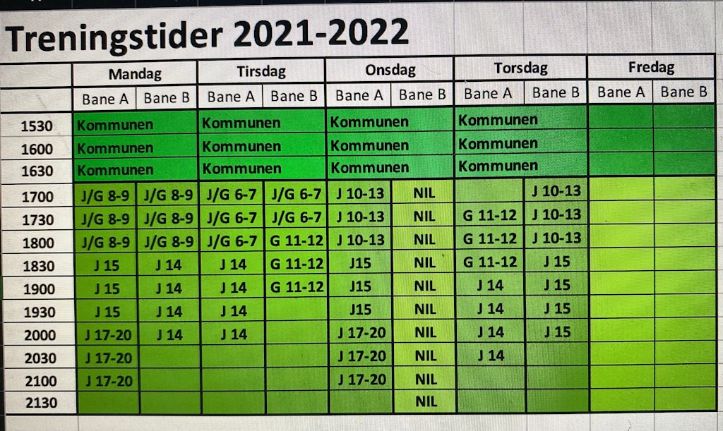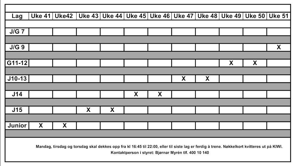 Mandag, tirsdag og torsdag skal dekkes opp fra kl 16:45 til 22:00, eller til siste lag er ferdig å trene. Nøkkelkort kvitteres ut på KIWI.